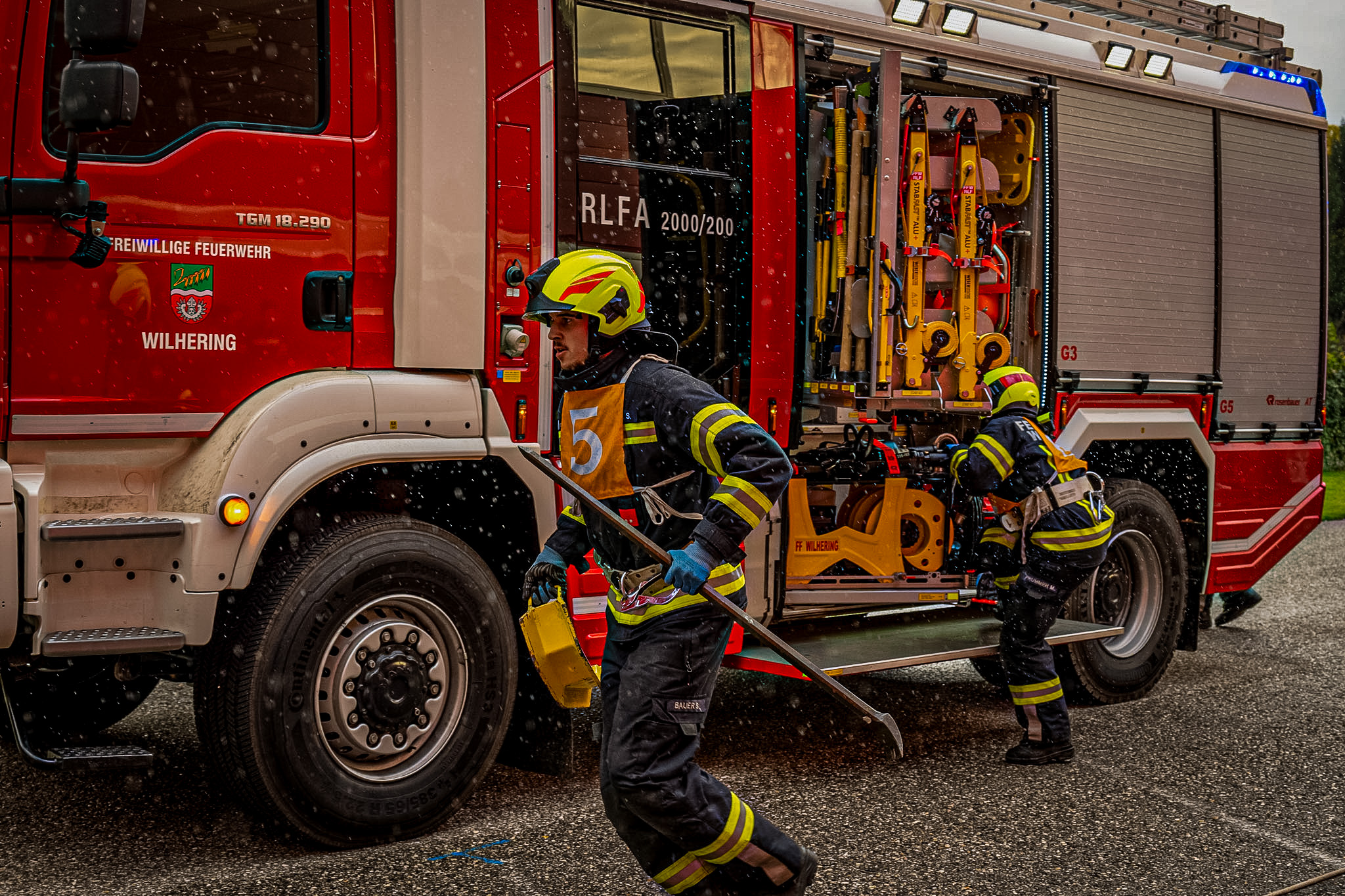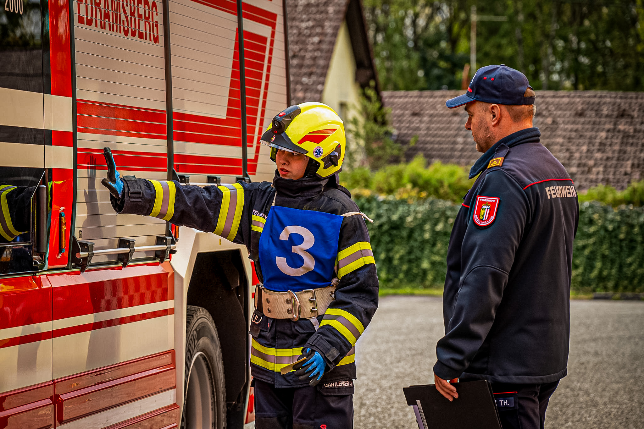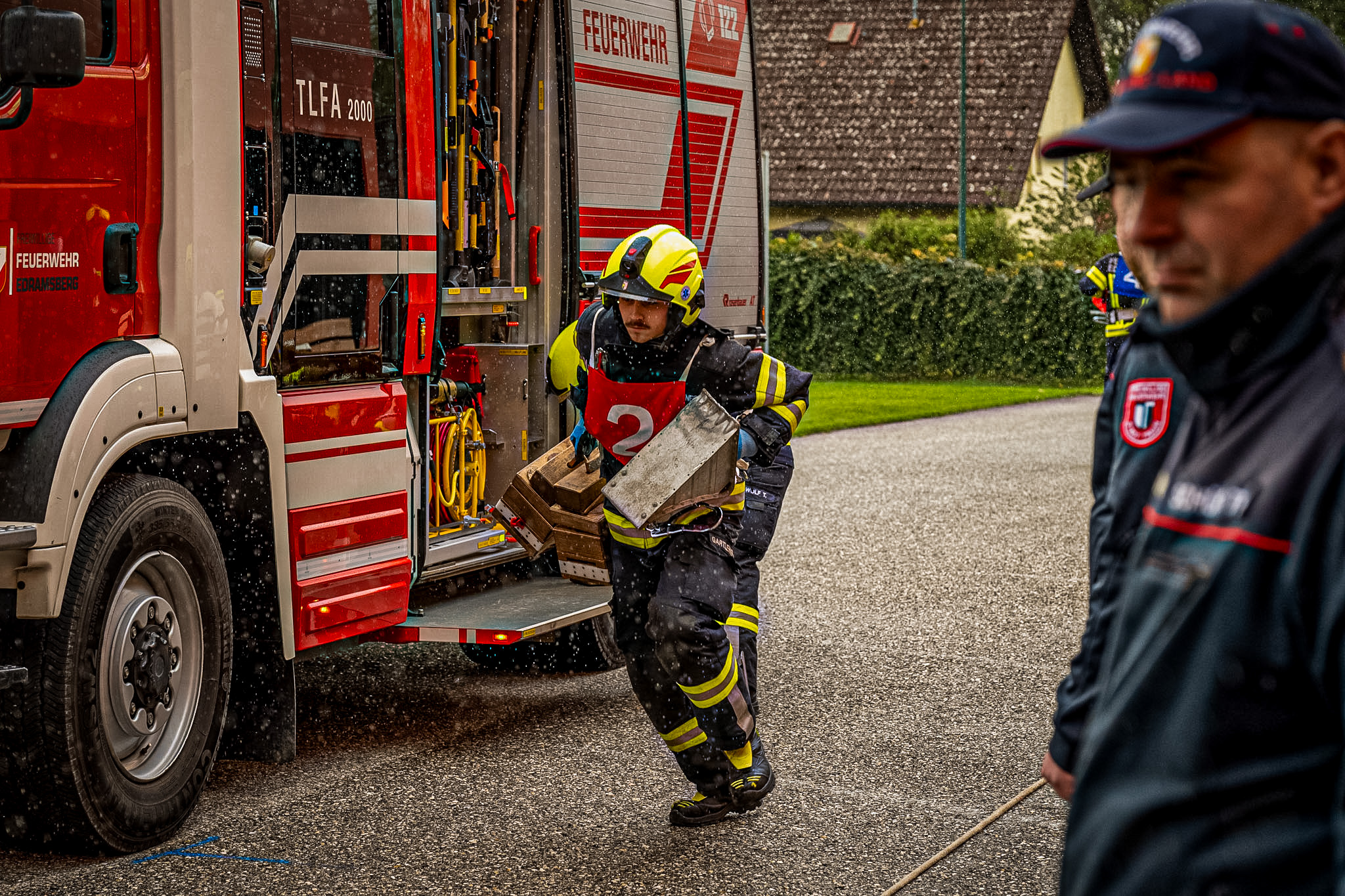 Zur Leistungsprüfung müssen die Teilnehmer in allen Stufen die Lage von je zwei Geräten – welche vom Bewerter Team des Bezirks Linz-Land ausgehändigt wird, auf eine Handbreite genau, bei geschlossenen Geräteraumjalousien anzeigen und die Lage genau benennen, bevor die Kontrolle erfolgt. In Anbetracht der beiden erstausrückenden Fahrzeuge TLF-A Edramsberg und RLF-A Wilhering und der umfangreichen Beladung, eine Herausforderung für sich. Allerdings auch ein gutes Training, um im Einsatzfall nicht lange nach den erforderlichen Gerätschaften suchen zu müssen.